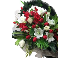 • Стандарт (роза - 16 шт., хризантема - 6 шт., зелень, оазис, корзина, лента)