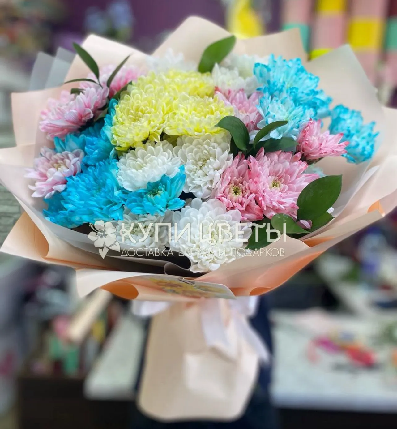 Этот необыкновенно пышный букет – настоящее облако из нежных лепестков, наполненное красками лета и весны. Мягкие оттенки розового, синего, белого и желтого гармонично переплетаются, создавая очаровательную и изысканную композицию.