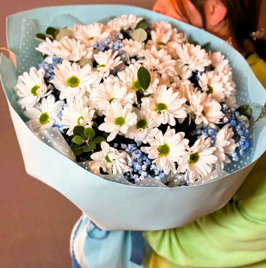 Кустовая хризантема ,гипсофила, упаковка,лента