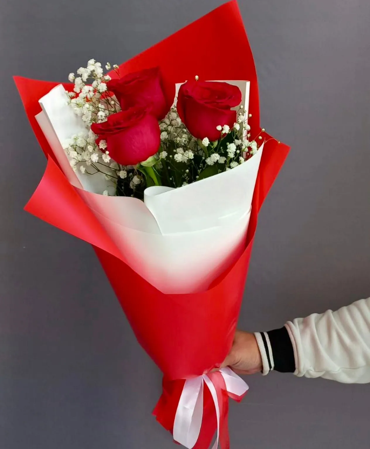Перед вами – символичное воплощение пылких чувств, сильных и ярких, заключенных в торжественное обрамление. Три глубокие, бархатные красные розы – это сердцевина этого букета, его страстный акцент. Каждая роза, с ее насыщенным, манящим оттенком, источает аромат, полный энергии и желания. Три розы – это классический символ любви, уважения и глубокой привязанности, говорят о силе чувств, которые не требуют лишних слов, но говорят сами за себя.