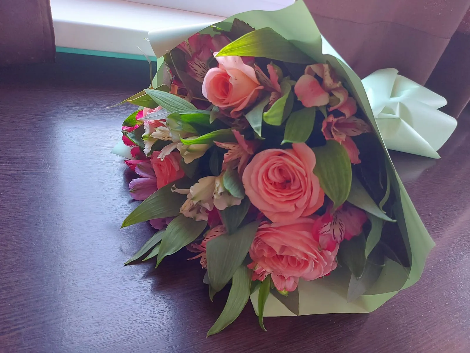 Розы,альстромерии,зелень,упаковка,лента
