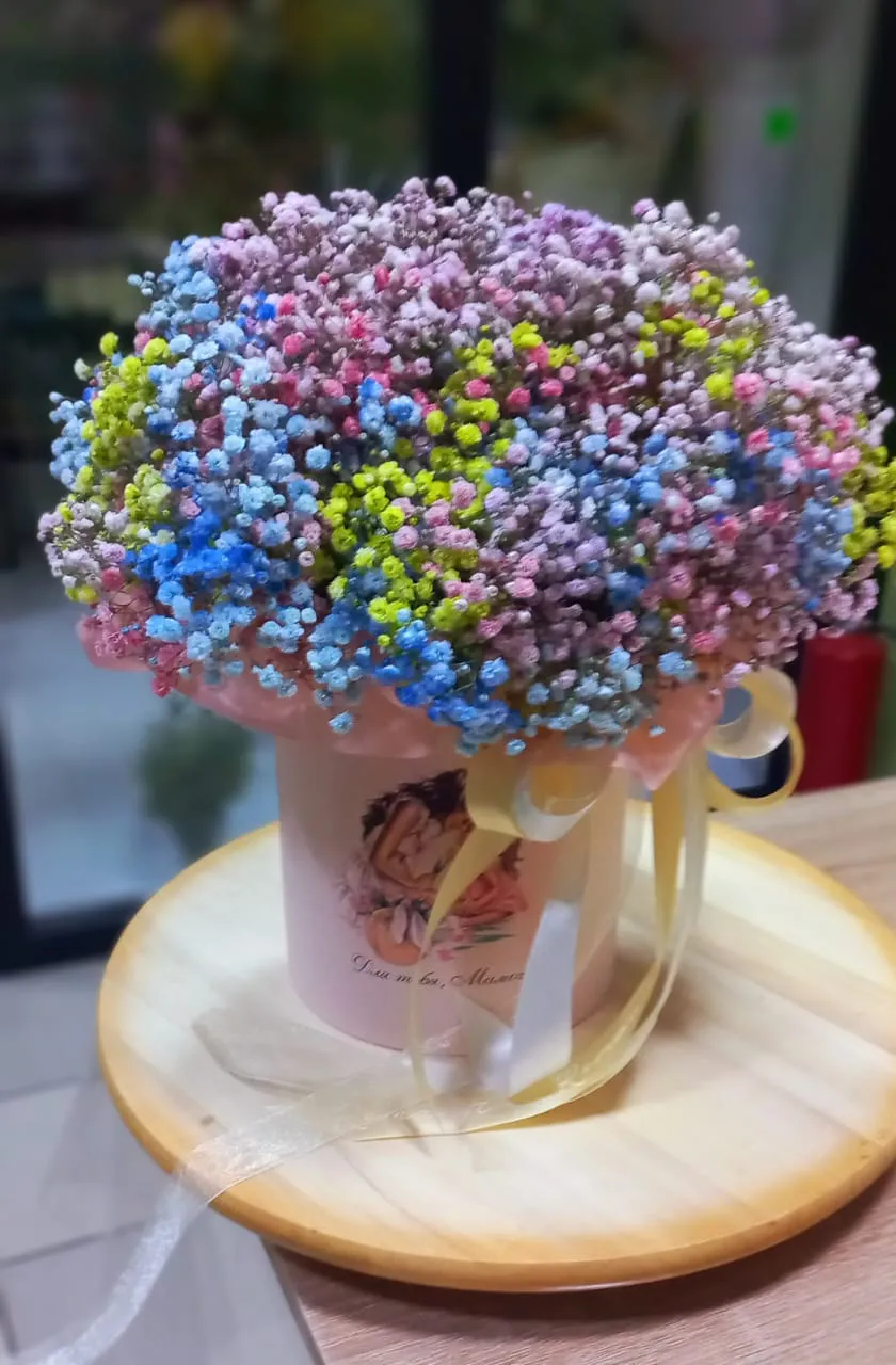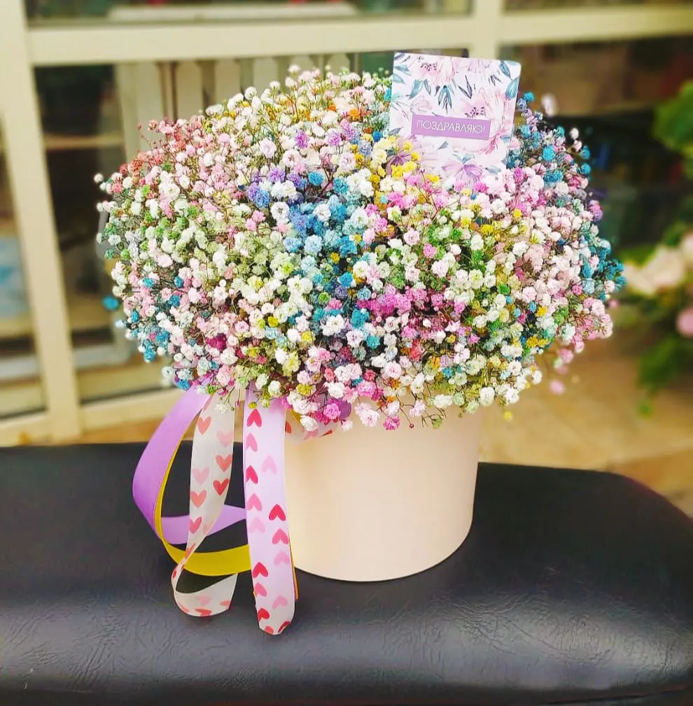 —Букет из радужной гипсофилы в шляпной коробке